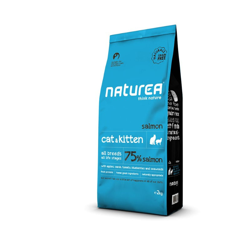 Como carnívoro, a escolha da dieta mais equilibrada para o seu amigo felino deve passar por uma elevada percentagem de proteína de origem animal. Naturea Naturals Salmon conta com 75% de salmão, dos quais 40% é fresco desossado e nunca congelado, 30% salmão desidratado e 5% hidrolisado. Esta é uma alimentação naturalmente adaptada para gatos de todas as idades, incluíndo gatos esterilizados. Além do peixe, as refeições do seu gato ficarão completas com Omega 3 e 6, anti oxidastes naturais (tocopherols), vitamina A, E e C. O seu equilíbrio óptimo entre cálcio e fósforo reduz a criação de placa bacteriana e ajuda a protecção dos dentes do seu melhor amigo.