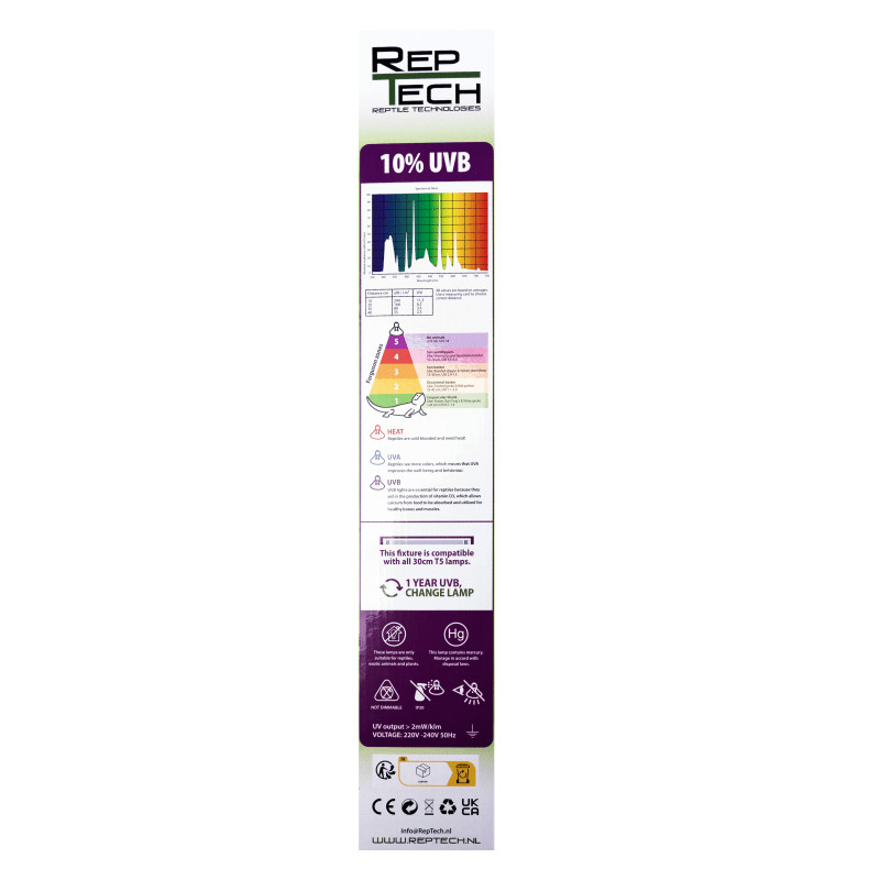 O RepTech REPT5 UVB 10% é um kit de iluminação T5 de alto desempenho, desenvolvido para répteis que necessitam de níveis elevados de radiação UVB. Ideal para espécies diurnas e heliófilas, este sistema ajuda a replicar condições naturais de exposição solar dentro do terrário.